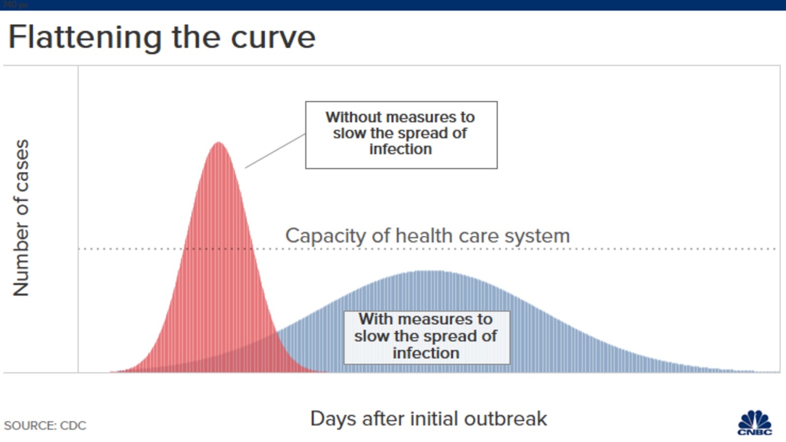 現階段的主要防疫方式,就是盡可能的減少人與人之間的接觸,好讓大規模感染的時間,盡可能的往後延(也就是把紅色區塊面積拉成藍色區塊面積),但是這種拖延戰術的策略,需要付出的代價是什麼呢?顯然就是實體民生經濟的極度蕭條,甚至是大規模倒閉。如此一來,不光是病毒對全民健康的傷害,因為各種防疫措施所不得已造成的經濟衰敗,在未來會發生的骨牌效應,其傷害恐怕更不是現在有辦法預測的。
